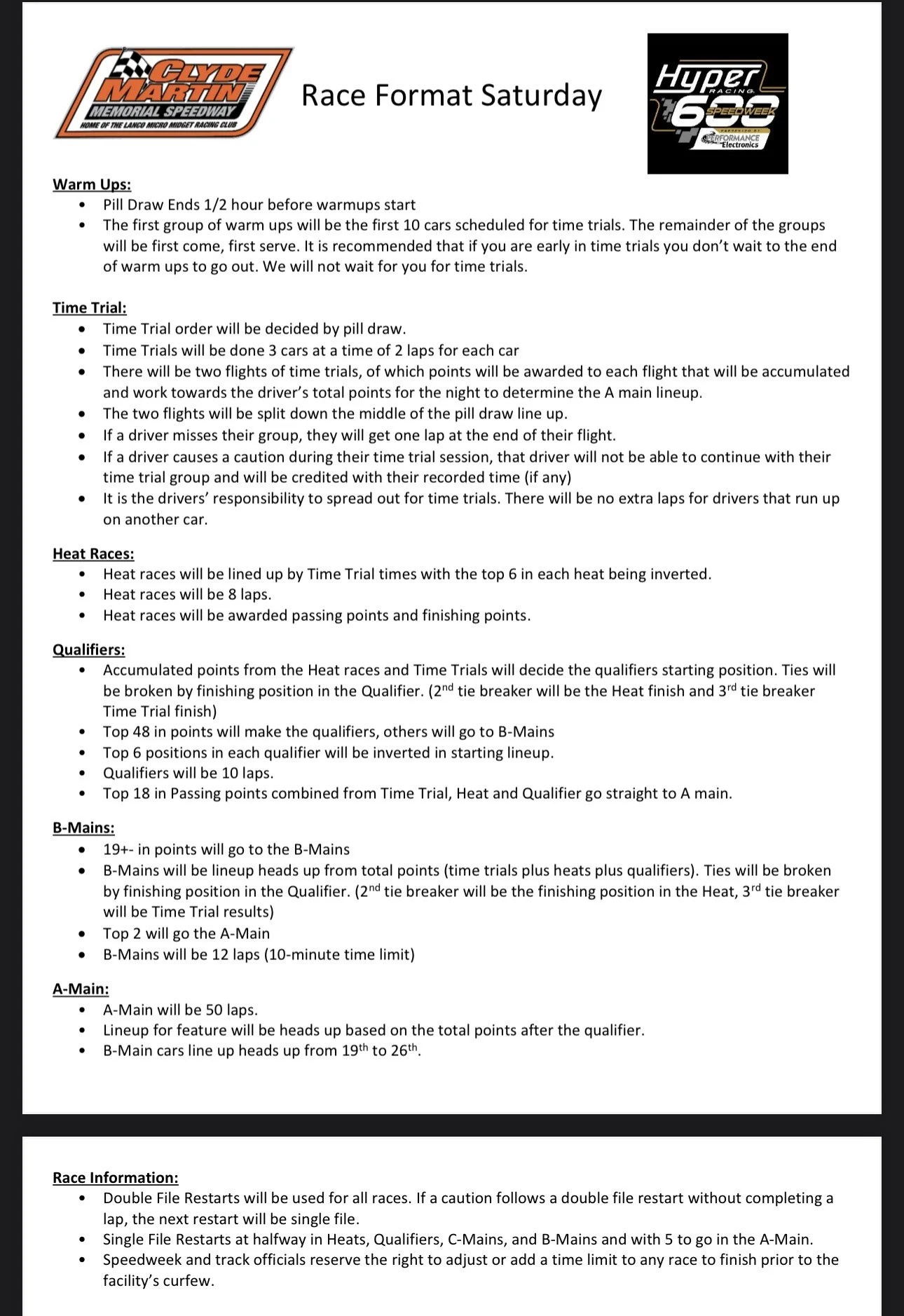 Saturday format is Pill Draw, Timed Warm Ups, Inversion of 4, passing points to line up A Main.